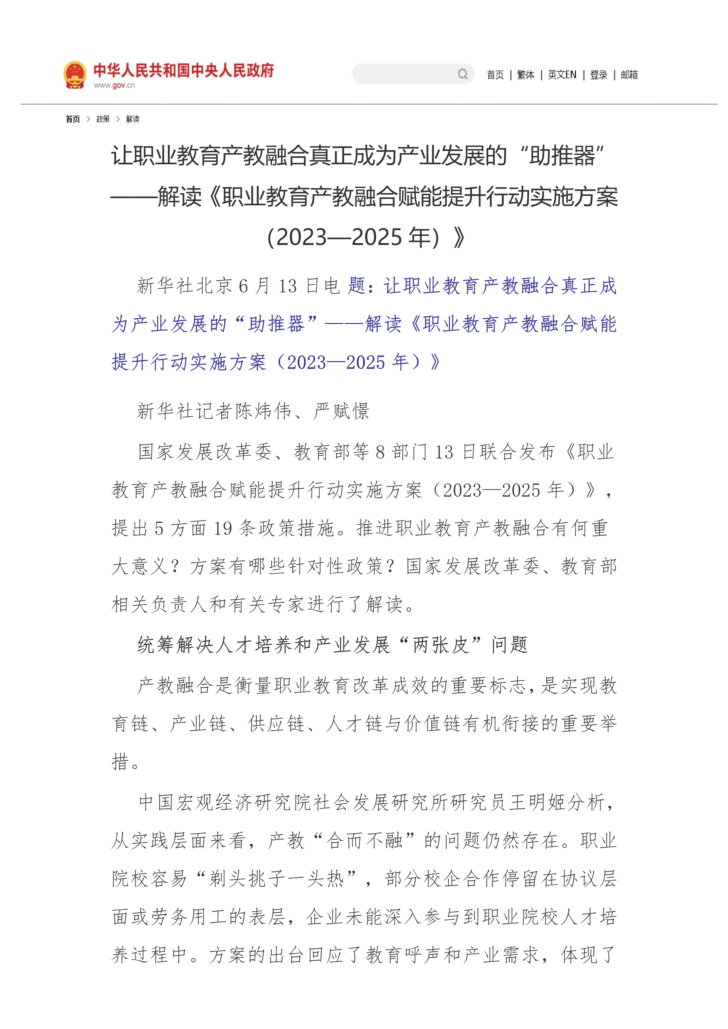 关于印发 《职业教育产教融合赋能提升行动实施方案 (2023—2025 年)》的通知
