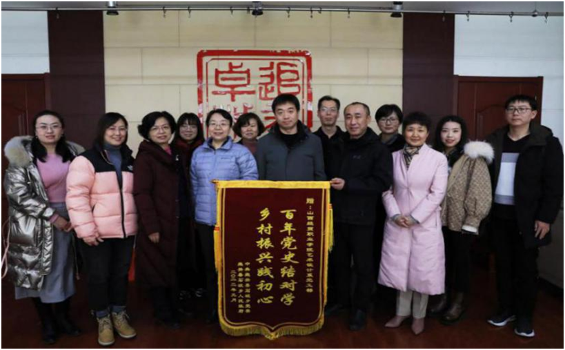 2022年1月4日石坡乡为表示对团队工作成果的认可和感谢,石坡乡党委书记郭强代表乡党委、政府专程来学院向艺术设计系赠送了“百年党史结对学、乡村振兴践初心”的锦旗,并表达了对学院、对艺术设计党支部及团队师生的由衷感谢。他讲到,壶关县南平头坞村作为山西电视台的帮扶点,是此次党史结对活动的受益者。艺术设计系师生利用自己的专业特长参与南平头坞村的“彩虹村庄”建设以及石坡乡旅游形象、养生茶系列包装设计,带动了当地千余人脱贫致富,取得了良好的经济效益和社会反响,真正将学党史、办实事与乡村振兴有机融合起来。接下来还是希望团队继续跟进。深入设计开发石坡乡文旅IP,并为更多农产品设计包装。院党委副书记彭月兰对项目活动也给出高度评价,指出,人尽其才,物尽其用,充分调动社会各方资源,精准帮扶有思路,在乡村振兴战略中探索出一条有效路径;“走出来”,乡村振兴不仅要引进来,还要走出去,开创性谋划高附加值的新型乡村特色产业,走高质量发展之路。