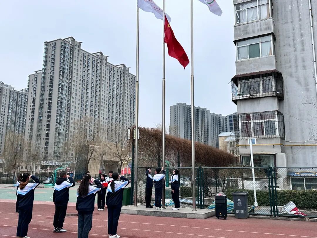 在主持人洪亮的宣布声中,升旗仪式正式拉开帷幕。国旗班的同学们身着整齐的校服,昂首挺胸,目光如炬,透着坚毅与庄重。他们迈着稳健而整齐的步伐,护送着鲜艳的五星红旗走向升旗台。随着《义勇军进行曲》那激昂雄壮的旋律响起,国旗在风中猎猎展开,缓缓升起。全场同学不约而同地行注目礼,神情肃穆,眼神中满是炽热的敬意与对祖国的无限热爱。