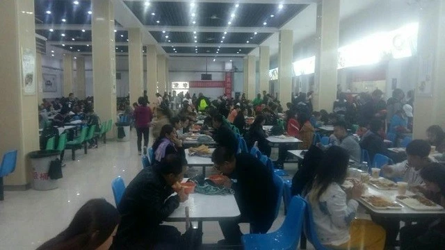 十月十二日新生军训开始,开饭时间更加集中,食堂内摩肩接踵,变成了红色的海洋。
