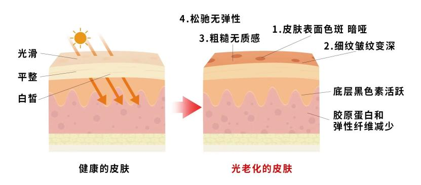 同时,在氧化反应下正常细胞功能改变,造成不同程度的光损伤积累,比如加剧角质异常增厚的“粗糙”、黑色素合成增多的“暗沉”、加重糖化氧化导致的“蜡黄”等肉眼可见的皮肤光老化损害问题。