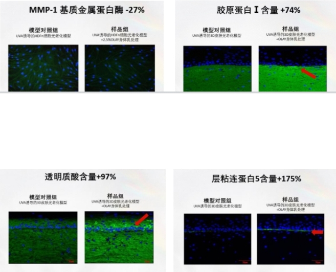 从医学实验层面来说,张成锋认为,这类身体乳一定需要严谨的配方和功效验证去支撑产品的有效性和安全性。比如OLAY美白身体乳,添加了含有5%的烟酰胺和泛醇,通过细胞和3D皮肤模型光老化实验,在大量实验数据的验证下,能够抑制MMP-1基质金属蛋白酶的表达、促进胶原蛋白Ⅰ(CollagenⅠ)、层粘连蛋白(Laminin5)、透明质酸(HA)含量的增加,从而提高皮肤的抗老化能力。
