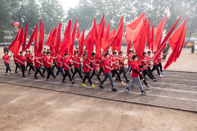 伴随着欢快的《运动员进行曲》,气宇轩昂,精神抖擞的国旗护卫队护送国旗入场。花束队、红旗队、各系部方队、裁判员方队、教职工方队和辅导员方队依次接受了主席台的检阅。他们朝气蓬勃,英姿飒爽、意气风发、激情飞扬,用嘹亮的口号、整齐的步伐、灿烂的笑脸、精彩的表演表达着对学院大家庭的一片深情和对祖国70华诞的美好祝愿。