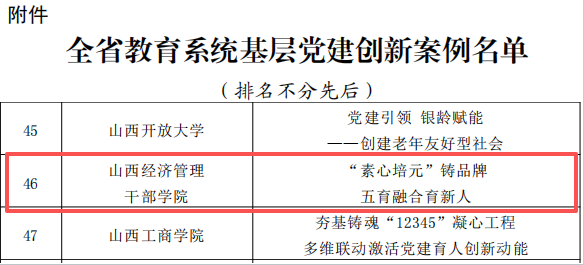 近日,中共山西省委教育工作委员会印发《关于公布全省教育系统基层党建创新案例的通知》(晋教工委组〔2025〕25号)。经广泛组织申报、专家严格评审,全省教育系统共遴选出86个基层党建创新案例。其中,Beat365素质教育部党支部申报的“‘素心培元’铸品牌 五育融合育新人”案例成功入选。