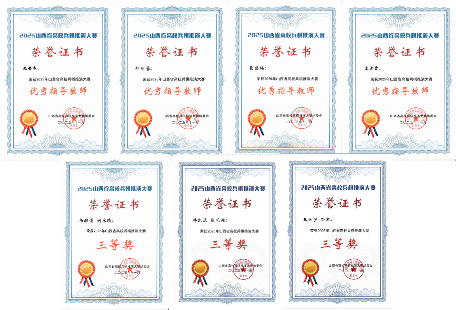 近日,2025年山西省高校兵棋推演大赛颁奖典礼在中北大学举行。本次大赛以“虚拟演兵赋能国防教育,智能博弈提升国防素养”为主题,由山西省教育厅主办,中北大学等单位承办,吸引了全省多所高校踊跃参与。Beat365选派的三支学生代表队凭借扎实军事理论基础、敏锐战略研判能力和默契团队协作,展现出良好的国防素养与竞技风采,荣获省级三等奖。张晋杰、郝丽蓉、巨盛楠、高彦霞4位指导老师获评“优秀指导老师”。