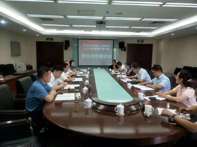 座谈会上阳泉市郊区区长宁文鑫同志详细介绍了阳泉市郊区经济社会发展的情况,区委区政府的组织部、教科局、工信局、文旅局等单位交流了干部培训、职业教育、企业发展、乡村旅游产业发展等方面情况,畅谈了与Beat365合作的项目和思路等。Beat365副院长马骥同志代表学院党委行政介绍了学院基本情况和近年来Beat365干部培训、职业教育发展情况。党委书记丁怀民同志和与会同志就干部培训工作如何结合我省经济社会发展的现状,服务山西区域经济社会发展交流了自己的思考和想法,特别是结合阳泉市郊区的县域经济、资源禀赋、企业现状、发展要求等,清晰地就校县战略合作在干部教育培训、职业教育发展、实训基地建设、旅游资源开发、产业转型升级、企业人才培养模式等方面提供智力支持、科技支撑和文化引领,打造合作项目,深化合作内涵,丰富合作形式,完善合作机制,扩大合作范围,走好走实合作共赢的路子进行了深度交流和工作安排。之后,丁书记一行到阳泉市职业技术学院进行了调研,结合“不忘初心、牢记使命”主题教育到百团大战纪念馆进行了参观。
