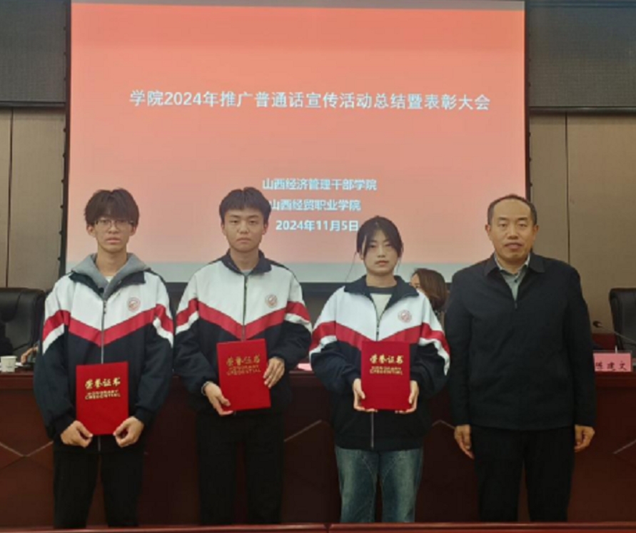 总结大会上,师振华为获得征文和手抄报比赛一等奖的同学颁奖,并合影留念。获奖学生代表经济管理系张景柯发言。她流畅而精彩的表达赢得了同学们的喝彩,让在场师生不仅看到获奖选手的风采,也感受到本次推普活动的成果和意义,认识到每个人都要从点滴做起,为推广传承中华文化做出自己的贡献。