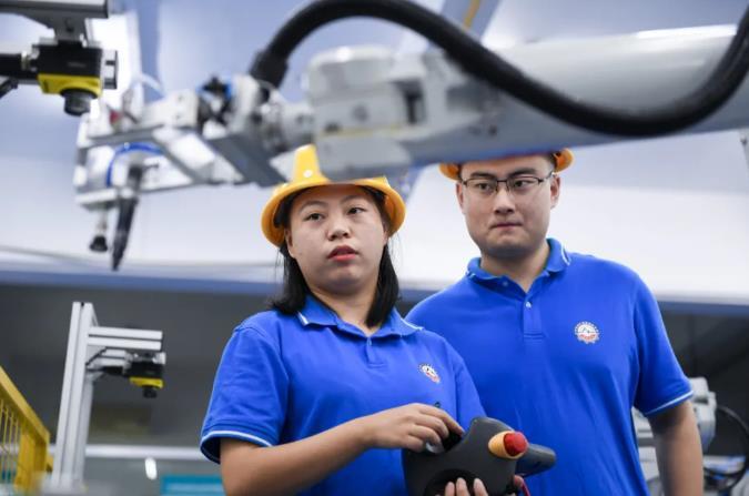 深圳职业技术学院学生在ABB机器人实训室练习操控工业机器人 毛思倩 摄