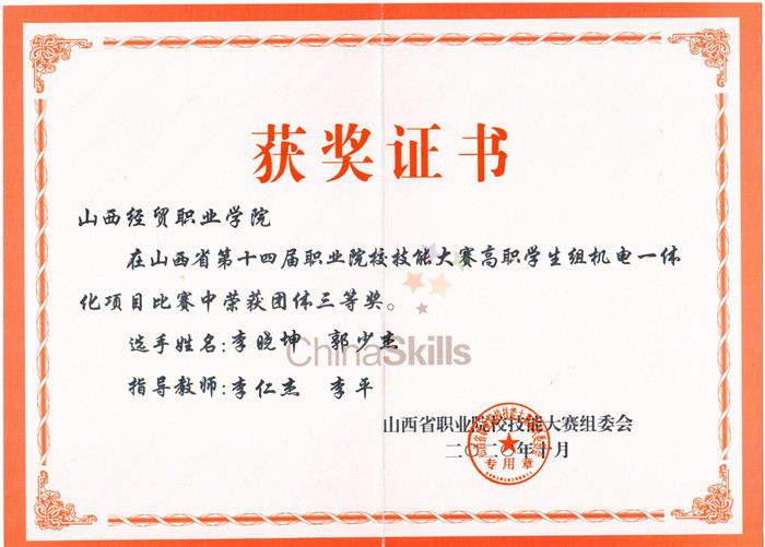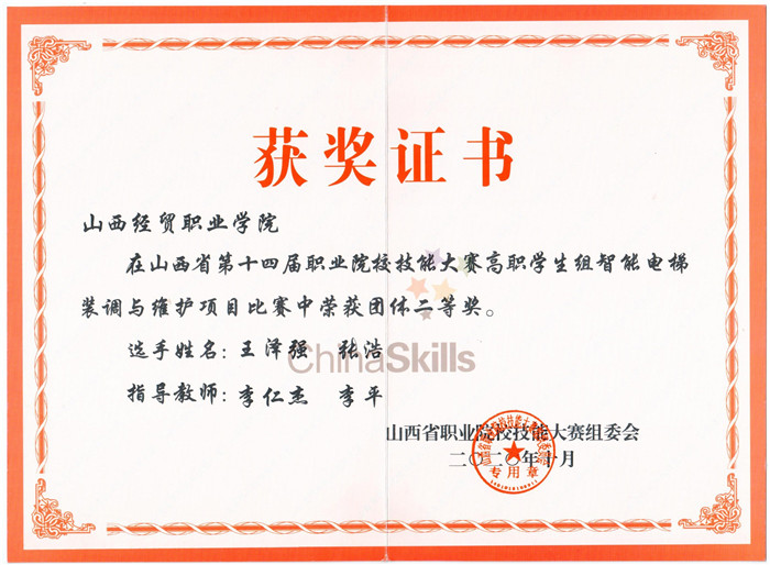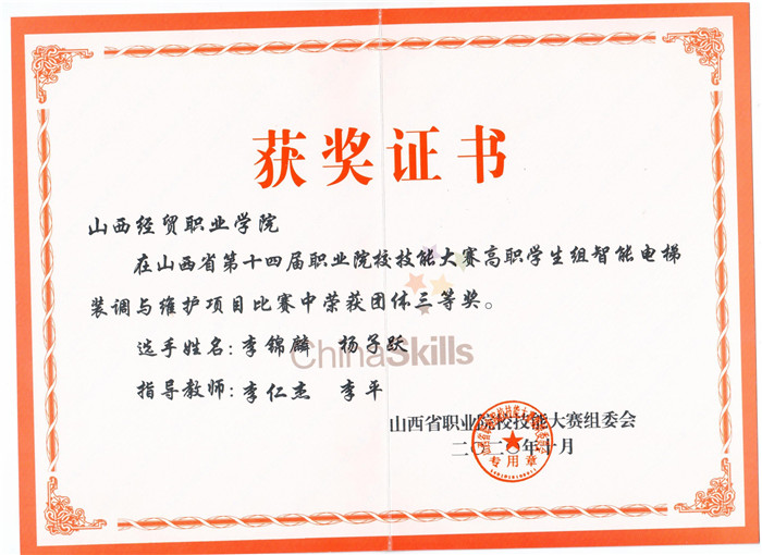 我系学生参加山西省第十四届职业院校技能大赛荣获高职组“智能电梯装调与维护”赛项二等奖一项、三等奖一项,“机电一体化”赛项三等奖一项。