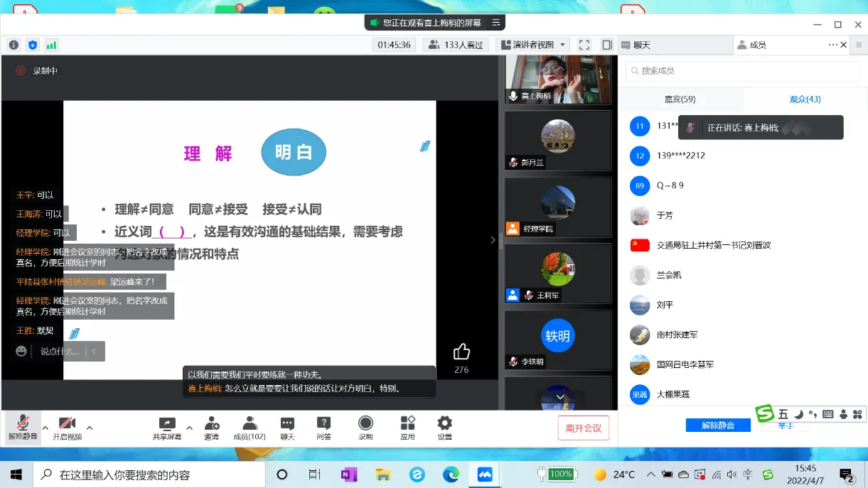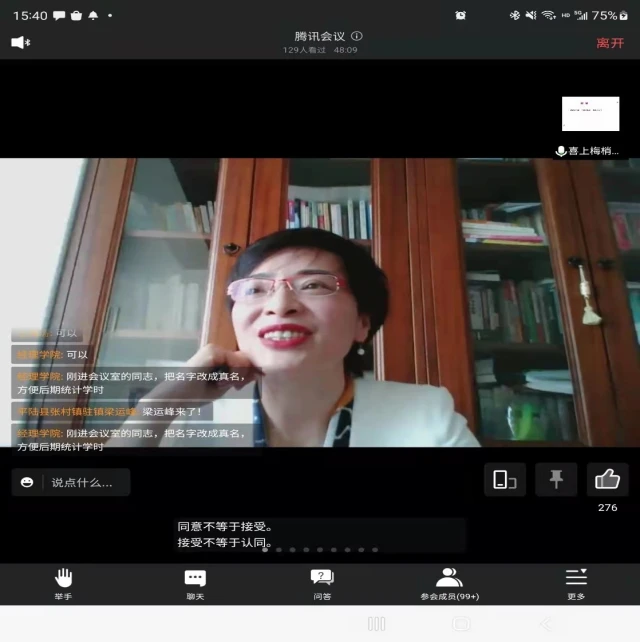 此次讲座的主讲吕书梅副教授,为北京大学访问学者,山西省领导科学研究会理事,山西省高级经济专业职务评审委员会委员。曾获山西省“优秀教师”,山西省优秀科技工作者,省直机关“道德模范”,被山西省劳动竞赛委员会荣记个人一等功一次、二等功一次。多年来,在省内外大中型企业、行政事业单位等各级组织培训讲学,服务过的单位数百家,听众数万人。讲座中,吕书梅老师结合沟通理论与驻村帮扶实际,从沟通能力是驻村帮扶工作的硬功夫、提升沟通效能的关键要素、驻村工作中的倾听与表达技巧等方面,凭借深厚的理论功底、深入浅出的讲授内容、脉络清晰的教学思维,深刻分析了在驻村帮扶工作中如何进行良好的倾听和回应,从而让驻村干部在开展工作中更好地说“真心话”“当地话”和“得体话”,提升自己的群众工作本领。讲座结束,吕书梅还与学员进行网络互动,对入户走访沟通中的方式方法耐心细致地回答了学员们的提问。生动精彩的讲座赢得了线上学员们的一致好评,大家纷纷表示讲座帮助大家学会了有效沟通的方法,有助于在今后的驻村工作中更有效地进行沟通交流,从而提升驻村工作的效果。