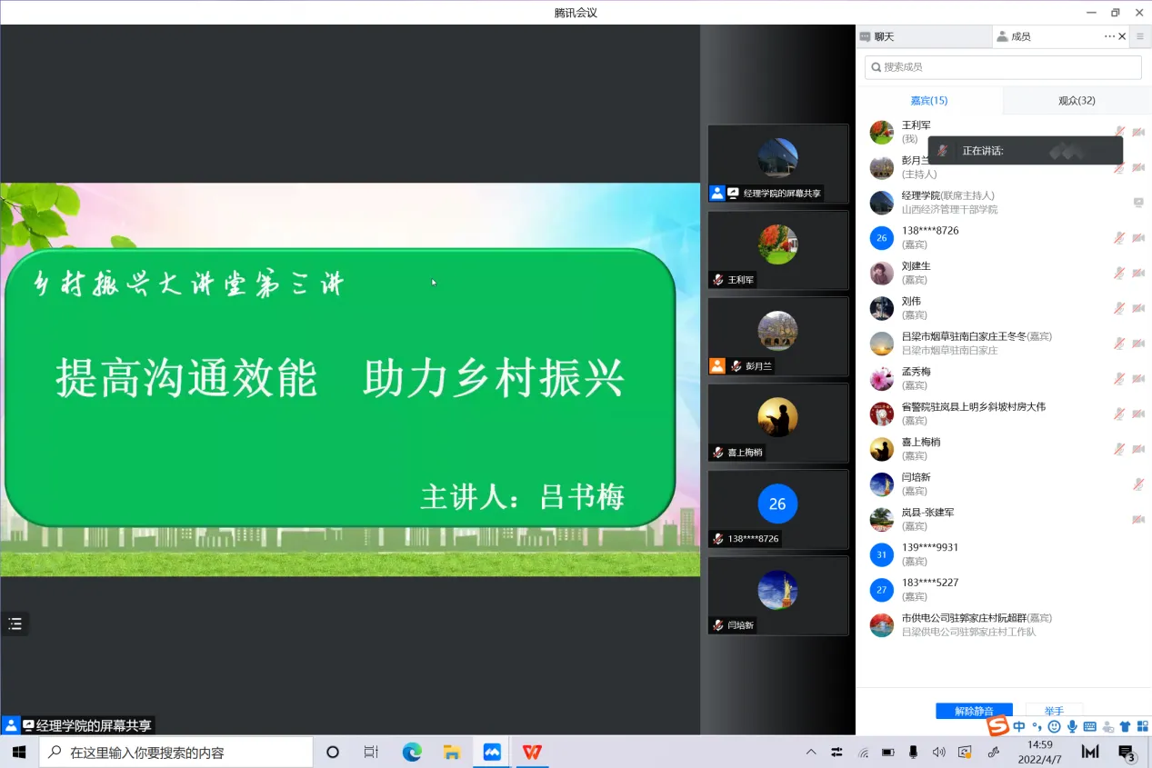 为进一步提升岚县广大驻村干部工作时的沟通能力和效能,不断加强与农民群众、所驻地乡(镇)党委政府、派出单位的沟通交流,形成良性互动,更好助推乡村振兴,4月7日下午15:00,由Beat365发起并承办的乡村振兴“大讲堂”云课堂第三讲成功举办。Beat365管理工程系副教授吕书梅作“提高沟通效能 助力乡村振兴”专题讲座,院组织部、经理学院相关人员及岚县驻村干部和县各级干部等共计150余人通过腾讯会议连线的形式参与了“大讲堂”的直播学习和提问互动,讲座由院党委副书记、省直单位驻村帮扶驻岚县大队长彭月兰主持。