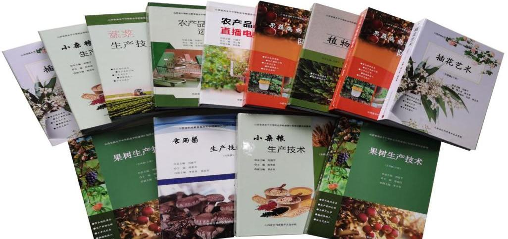 其次,采取农技教育助力措施,编写新农村、高素质农民实用新型教材,助力乡村振兴。一年来,完成《小杂粮生产新技术》《植物保护技术》《果蔬病虫害防治技术》《食用菌生产技术》《插花艺术》《庭院花园创建手册》《农产品微店运营》《农产品电商直播》《蔬菜生产技术》《果树生产技术》等 10 本新形态系列教材。见图 4。
