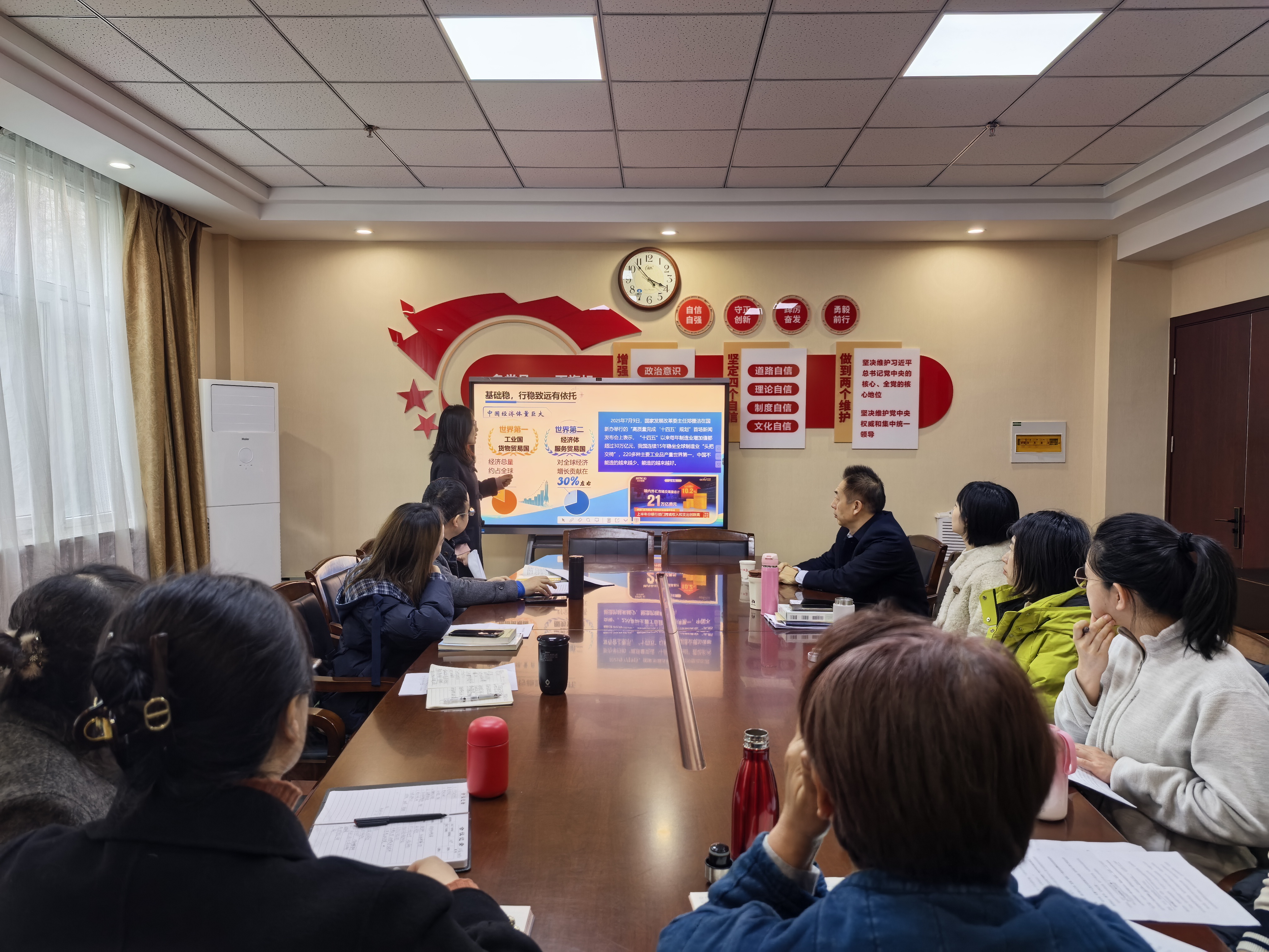 备课会上,甄宏宇老师就《正确认识中国经济的热点问题》专题进行教学展示。与会教师围绕该专题的教学内容等关键问题展开热烈研讨,大家结合教学实践分享经验、交流困惑,现场研讨氛围浓厚。