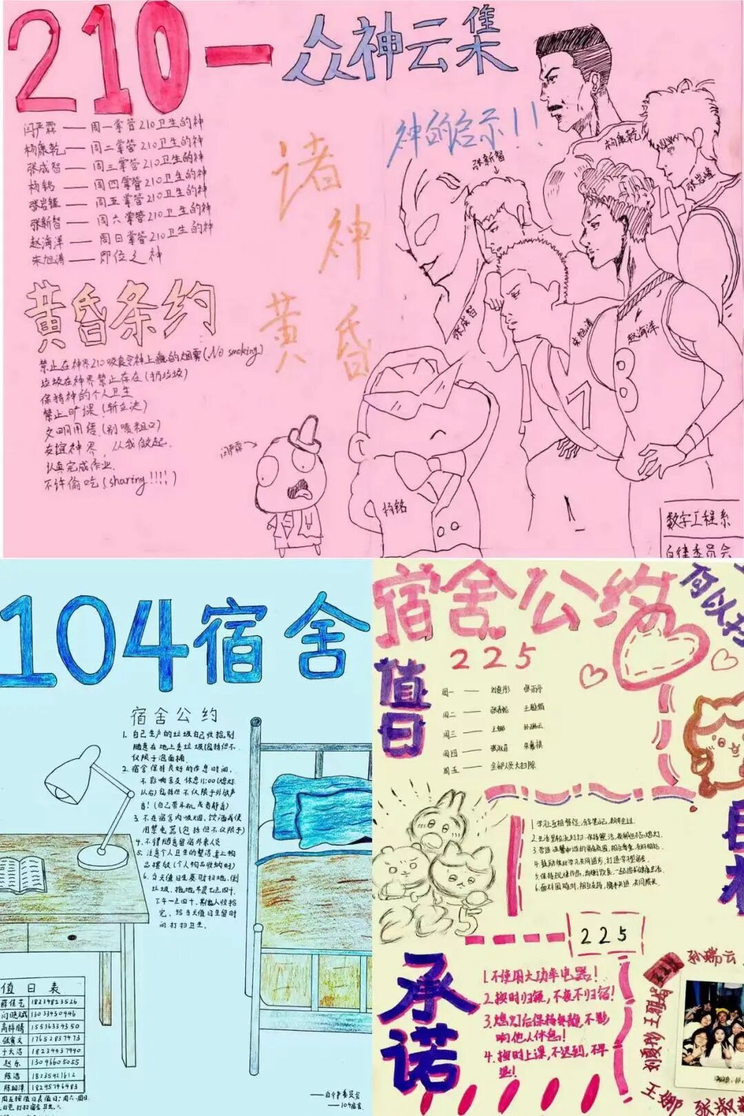为助2025级新生适应大学生活、营造良好宿舍环境,我系于2025年10月30日开展了宿舍小天地共识大文章主题班会,各宿舍经讨论制定《宿舍公约》,涌现一批实用且具创意的优秀作品。现公示评比结果如下: