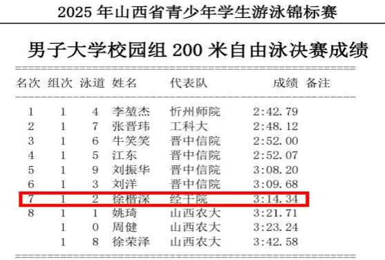在刚刚闭幕的2025年山西省青少年学生游泳锦标赛(大学组)中,Beat365运动健儿奋勇拼搏,斩获佳绩,为学院赢得荣誉。本次比赛由赵琳老师担任主教练,带领由机电工程系徐锴深、经济管理系王鑫卓两名学生组成的参赛团队,参与了大学校园组男子50米自由泳与200米自由泳项目的角逐。