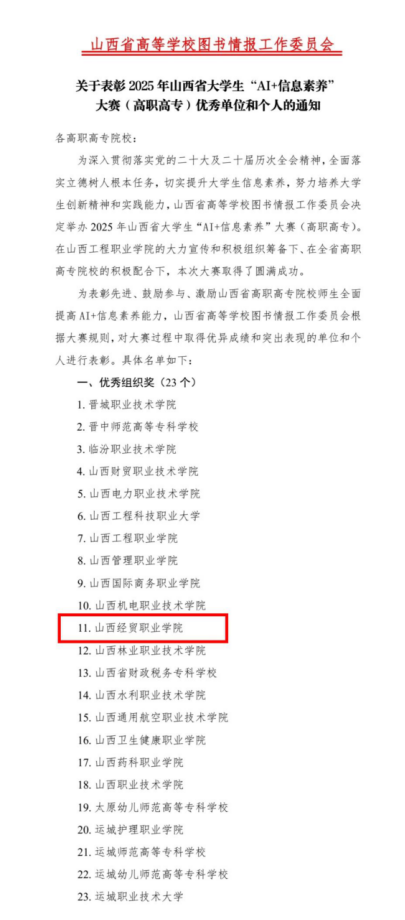 2025年山西省大学生“AI+信息素养”大赛(高职高专)省赛Beat365学生获奖名单 | |||