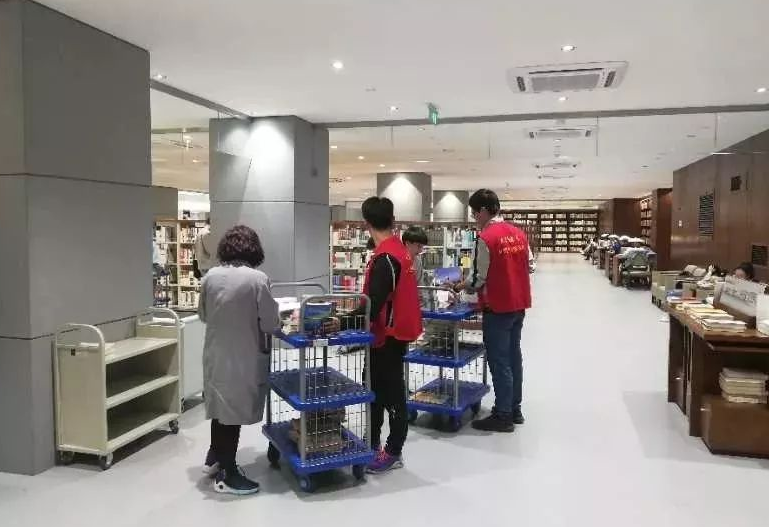 下午3点,志愿者们到达目的地。着装整齐精神抖擞地在图书馆等候活动安排。本次活动主要负责图书馆二层和少儿馆亲子馆两个区域。在工作人员的组织安排下,志愿者们分成了两组,每个小组在组长的带领下,在图书馆负责老师的指引下有条不紊地开展活动。在活动过程中志愿者们干劲十足、团结一致。一个个身着红色志愿马甲的同学奔忙穿梭在浓郁墨香的书籍中,挥洒着汗水,在紧张的活动指挥中也不了欢声笑语。通过志愿者们两个多小时的不懈奋战,图书馆堆积着杂乱无章的书籍全部整齐排列在书架上,整个图书馆被“改造”的焕然一新。