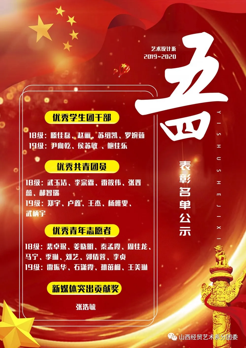 先进团支部:18室内一班、19室内三班。如对上述推荐表彰集体、个人有异议者请于公示期2020年5月7日起至2020年5月9日止与艺术系分团委联系。