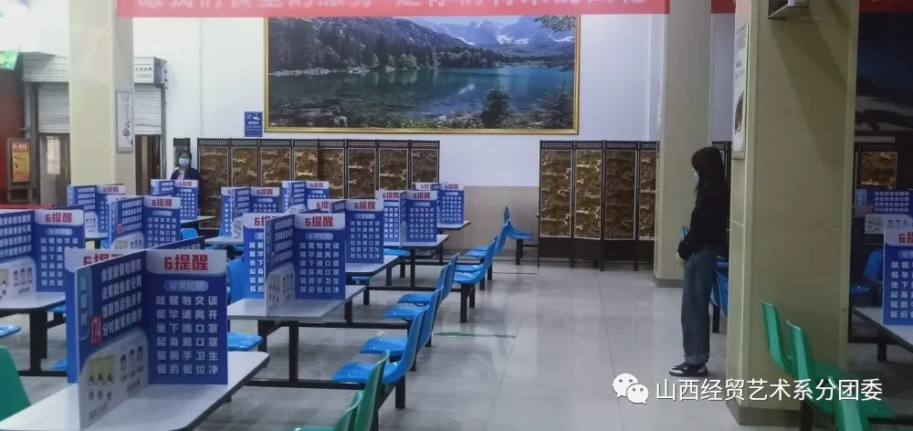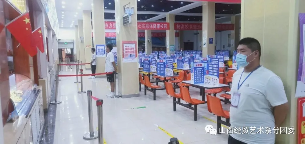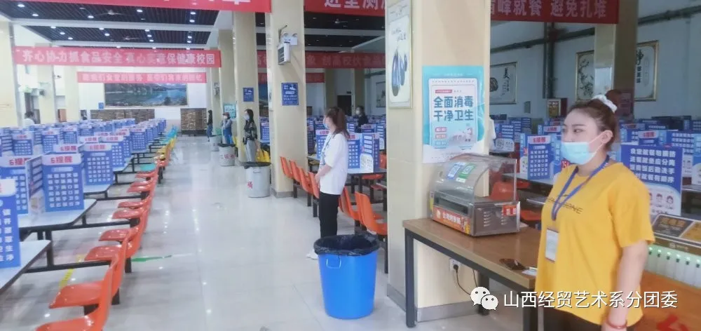 用餐方面,每个志愿者在学校用餐,早、中、晚三餐按时间值班,提醒学生佩戴口罩,保持距离;打餐排队区指引排队,保持一米距离;就餐区引导学生按座位桌面标识间隔就坐,小组长与值班老师时刻在食堂做好保障,最大限度上保证同学们的就餐安全。